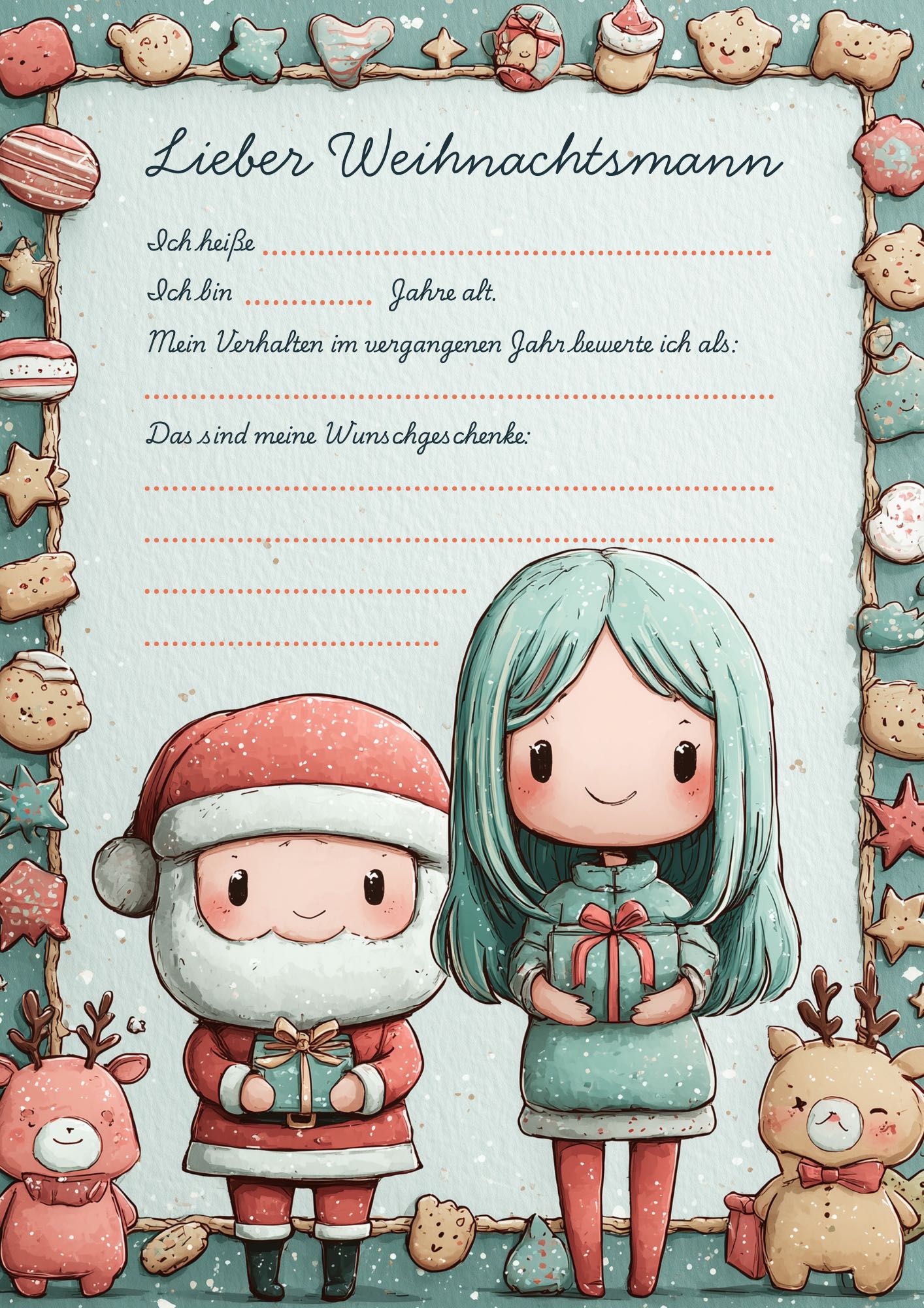 Ein zauberhafter Brief an den Weihnachtsmann im Kawaii-Stil, ausgefüllt von deinem Kind. Du erhältst eine sofort downloadbare Datei zum Ausdrucken zu Hause oder in einer digitalen Druckerei. Liebevolle Illustrationen machen die Weihnachtsmagie noch echter!