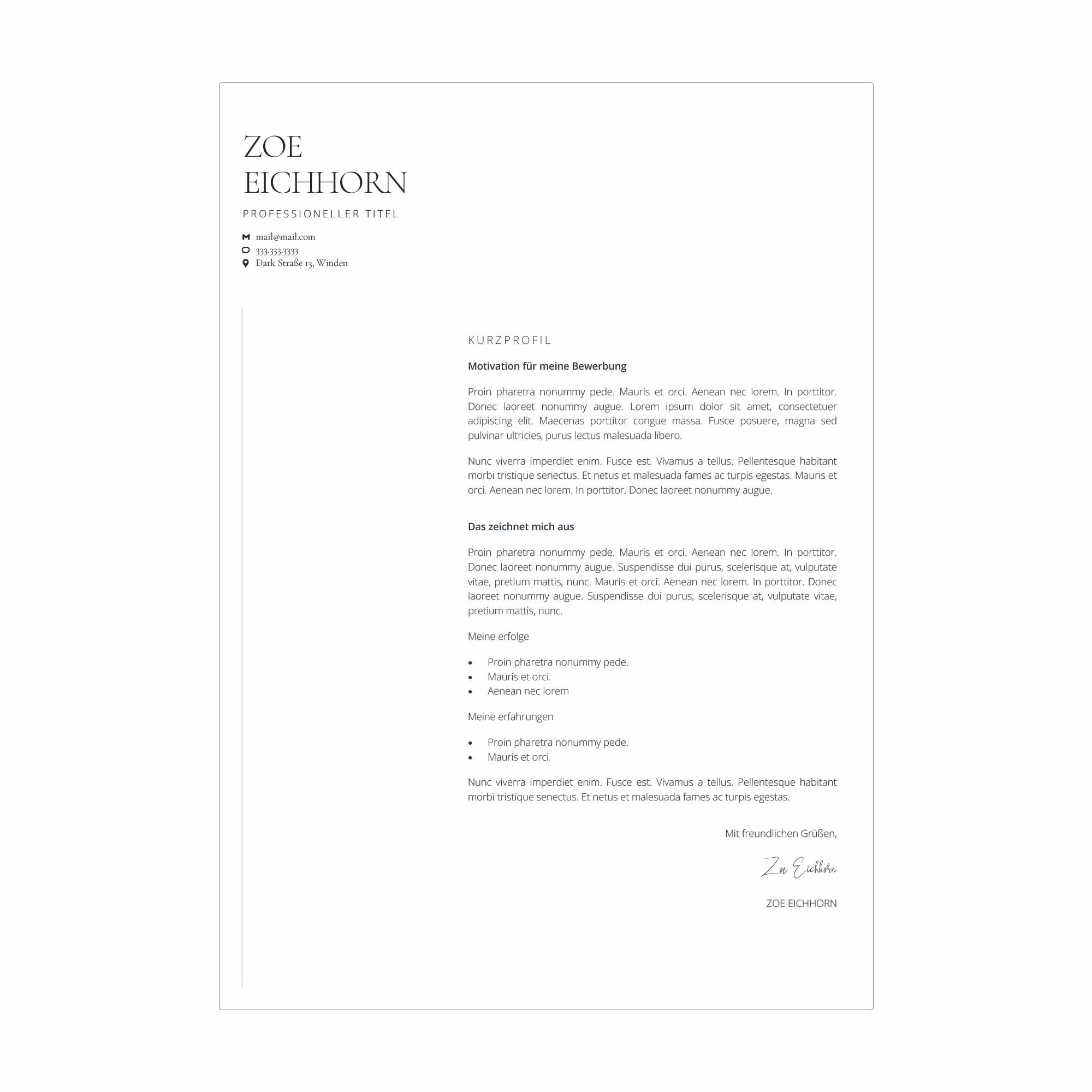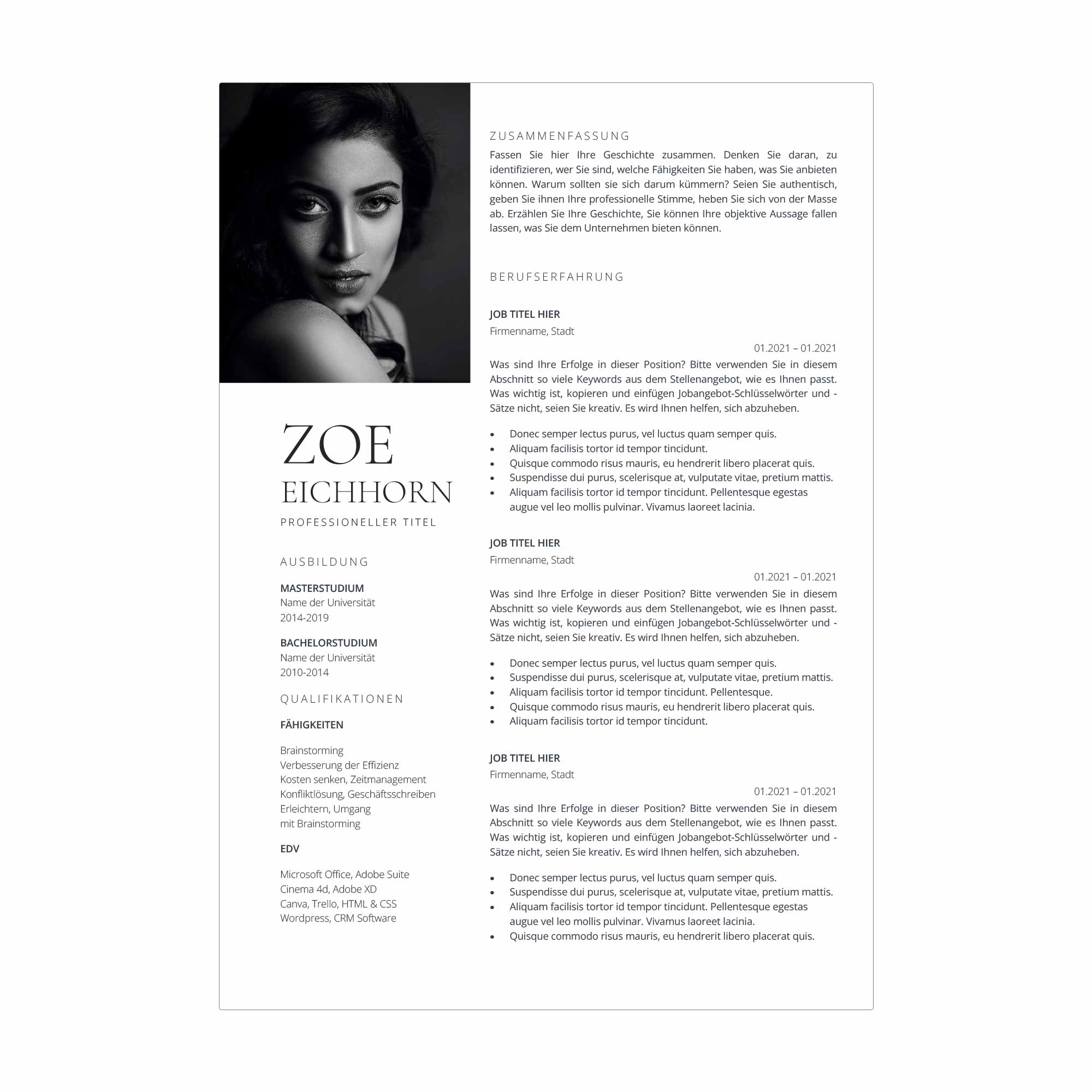 Sie passen sich verschiedenen Branchen und Positionen an. Mit unseren Vorlagen präsentieren Sie sich von Ihrer besten Seite und heben sich von der Konkurrenz ab. Nutzen Sie die Chance, Ihre persönliche Marke zu stärken und Ihre Karriere voranzutreiben.