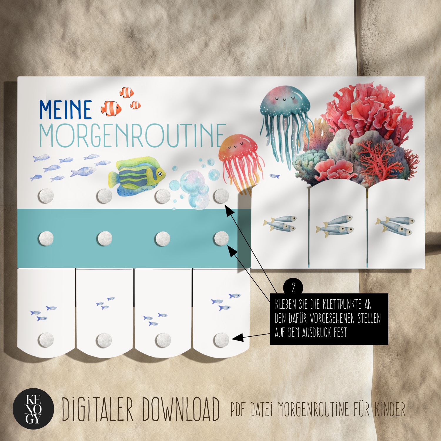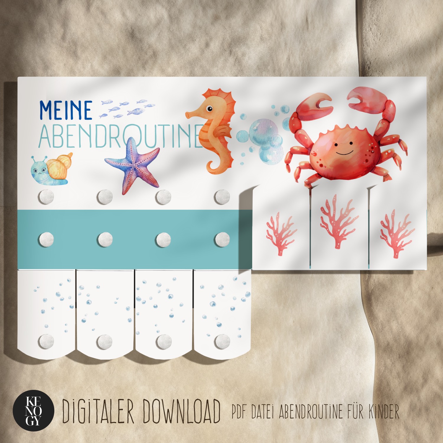 Mit der Morgenroutine Kinder und Abendroutine Kinder als herunterladbarem PDF bringen Sie spielerisch Struktur in den Alltag. Die liebevoll gestalteten Aquarell-Illustrationen mit Ozean-Tieren (Fische, Korallen & Krebse) machen den Routineplan Kinder besonders ansprechend und motivierend. Klare Symbole, kurze Aufgaben und das Umklappen jeder erledigten Aktivität fördern Selbstständigkeit, Übersicht und Routine – ideal für Kleinkinder, Vorschulkinder und Grundschulkinder. Die Morgenroutine Kita eignet sich nicht nur für Zuhause, sondern auch für Gruppen im Kindergarten oder in der Vorschule – perfekt als Morgenroutine Kinder PDF und Abendroutine Kinder PDF zum Ausdrucken.
