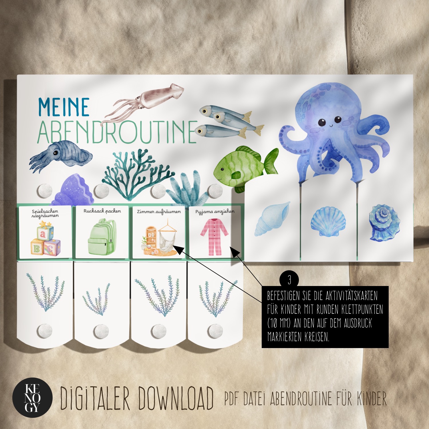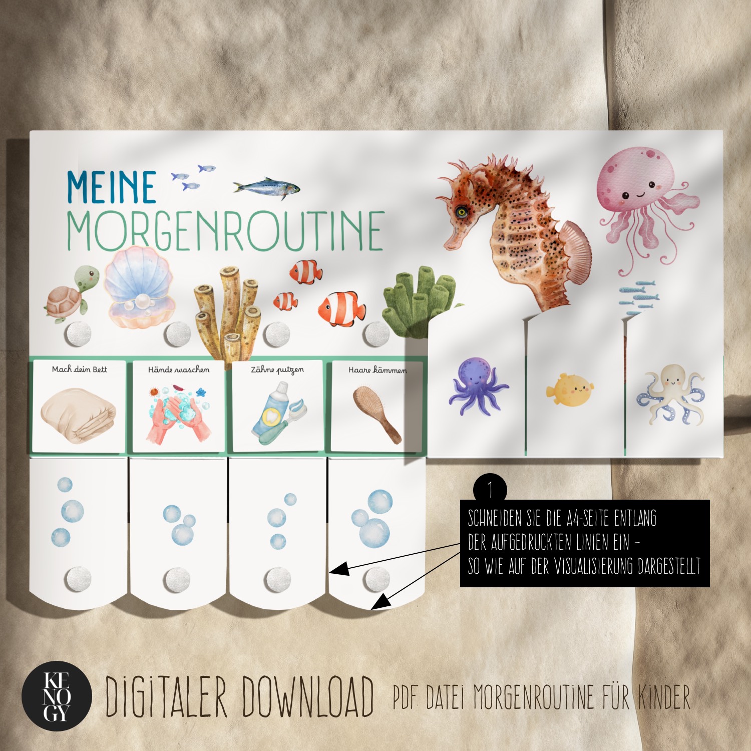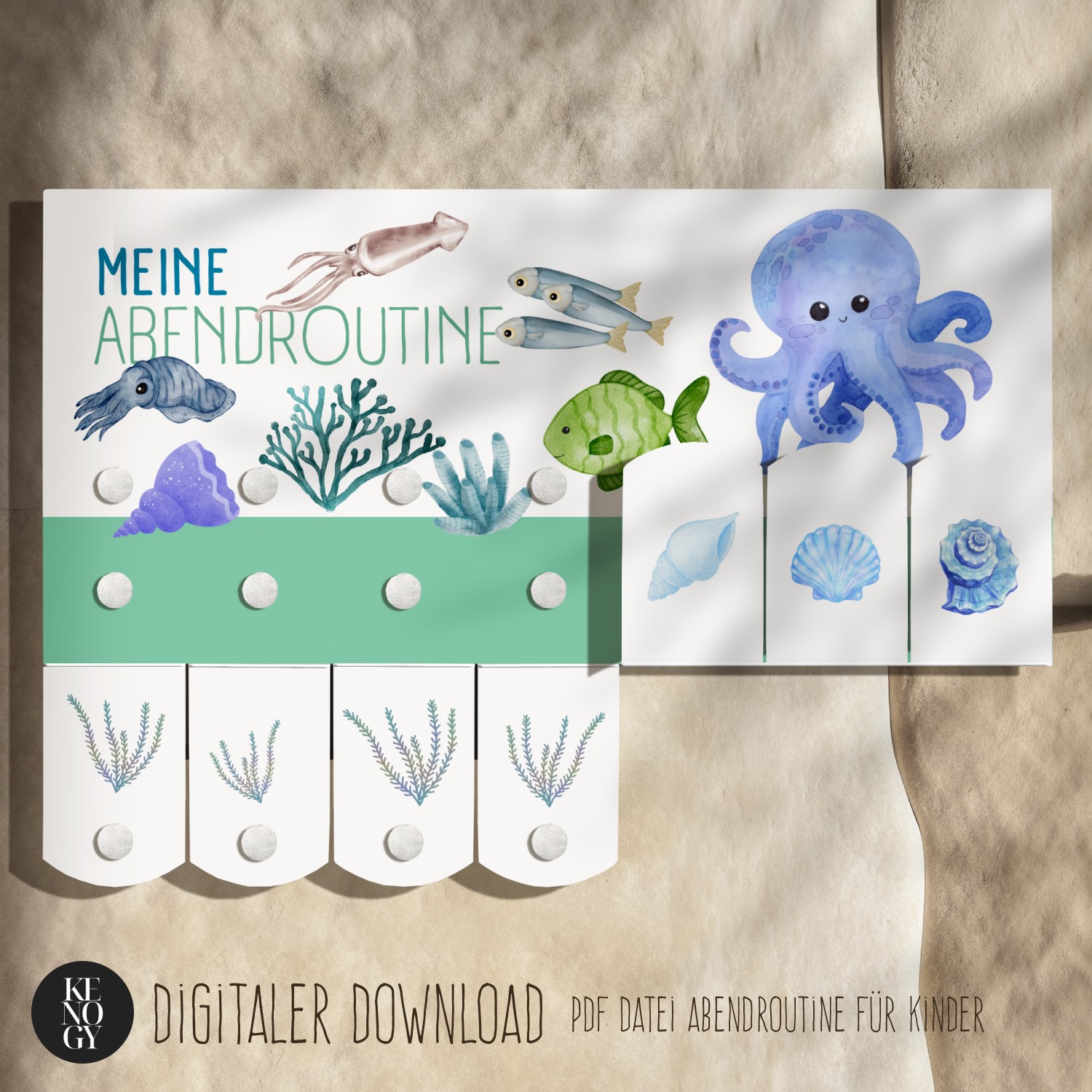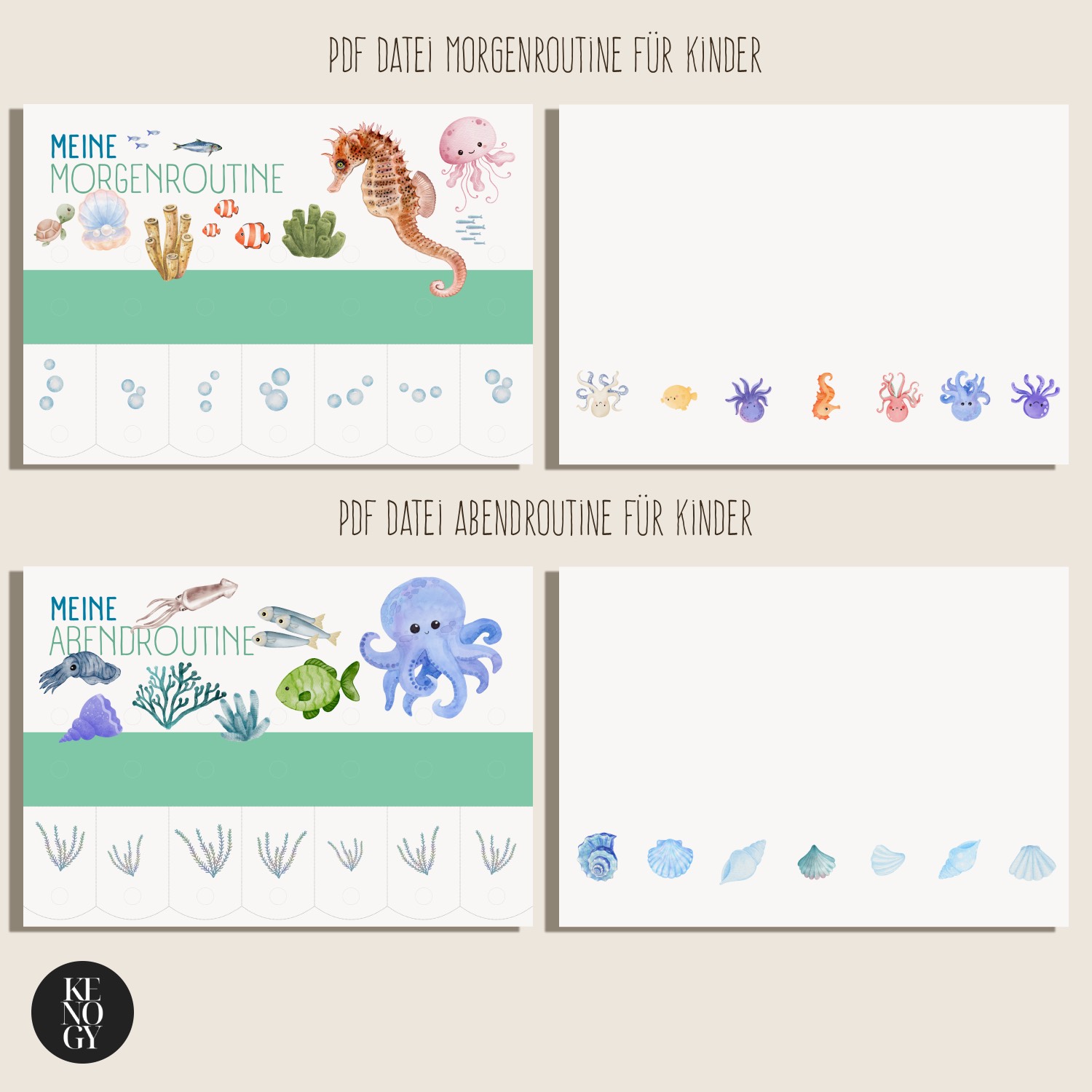 Mit der Morgenroutine Kinder und Abendroutine Kinder als druckbarem PDF erhalten Sie eine praktische Lösung, um den Tagesablauf spielerisch zu strukturieren. Die zauberhaften Aquarell-Illustrationen mit Ozean-Motiven (Fische, Korallen & Krebse) machen den Routineplan für Kinder besonders attraktiv und motivierend. Deutliche Symbole, einfache Aufgaben und das Abhaken jeder erledigten Aktivität fördern Selbstständigkeit, Übersicht und eine beständige Routine – optimal geeignet für Kleinkinder, Vorschulkinder und Grundschulkinder. Die Morgenroutine Kita passt nicht nur perfekt für Zuhause, sondern auch als strukturierte Morgenroutine in der Kita – ideal als Morgenroutine Kinder PDF und Abendroutine Kinder PDF zum Ausdrucken.