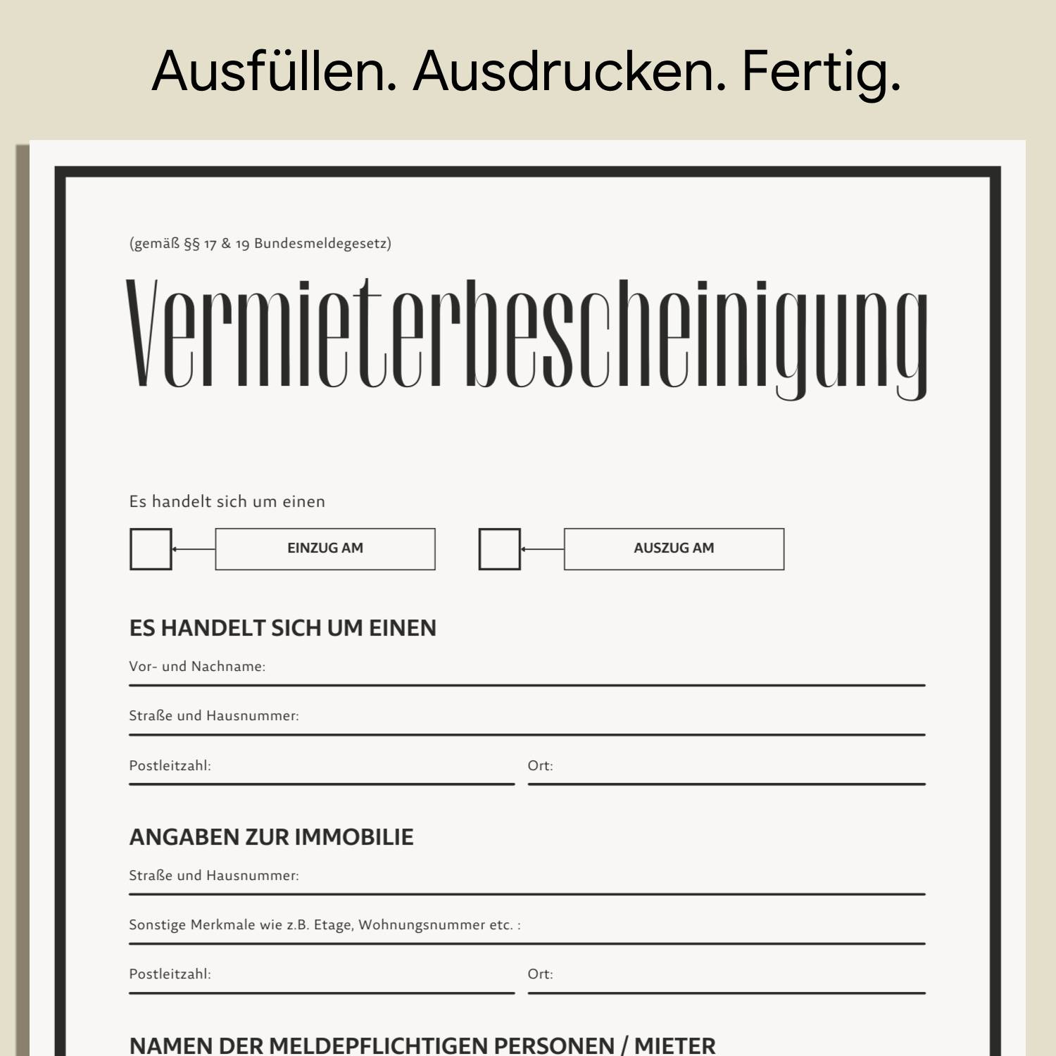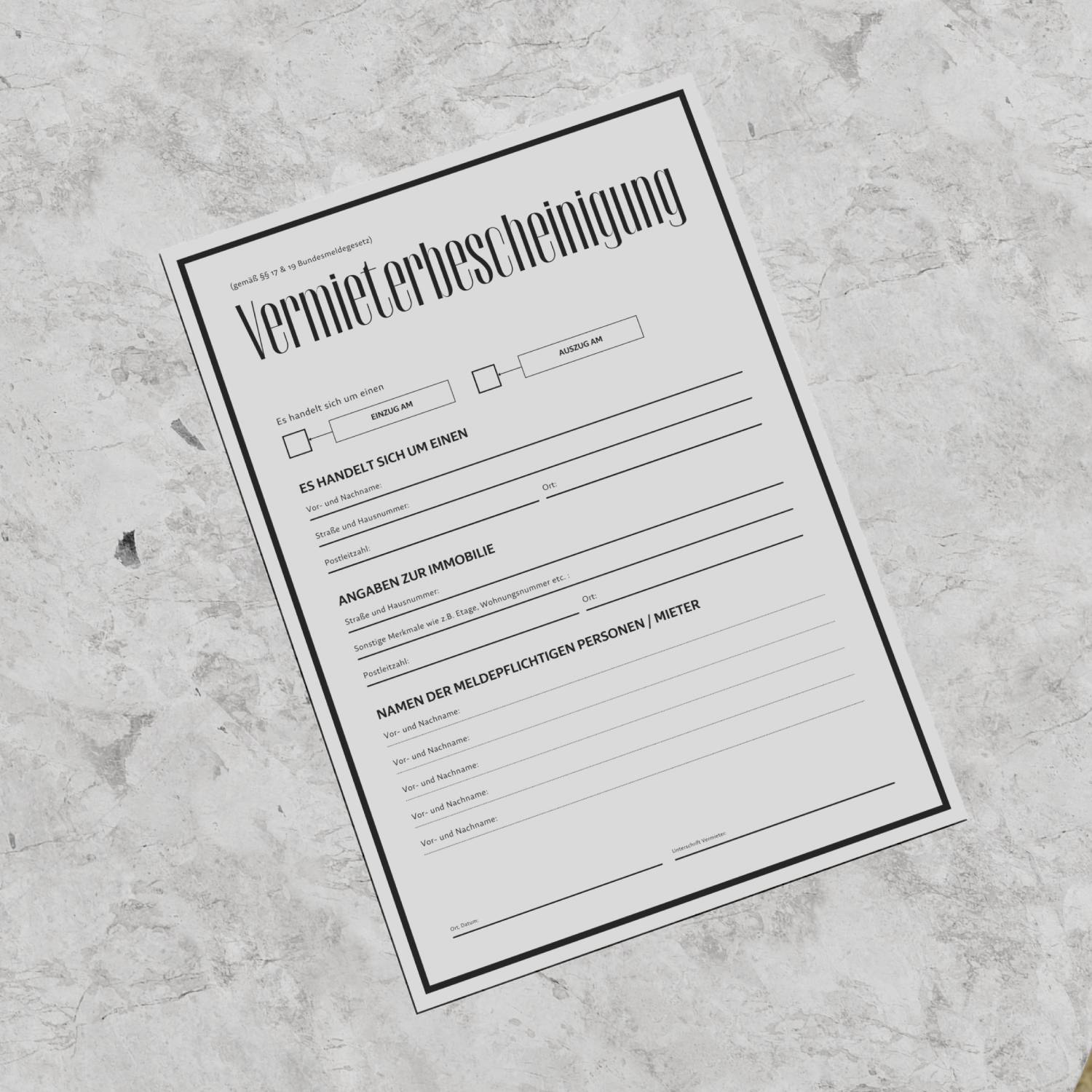 Nach dem Kauf steht Ihnen die Vermieterbescheinigung sofort zum Download bereit. Kein Versand, keine Wartezeit, keine Komplikationen. Drucken Sie das Formular so oft aus, wie Sie möchten – für jeden neuen Mieter, für jede Wohnung.