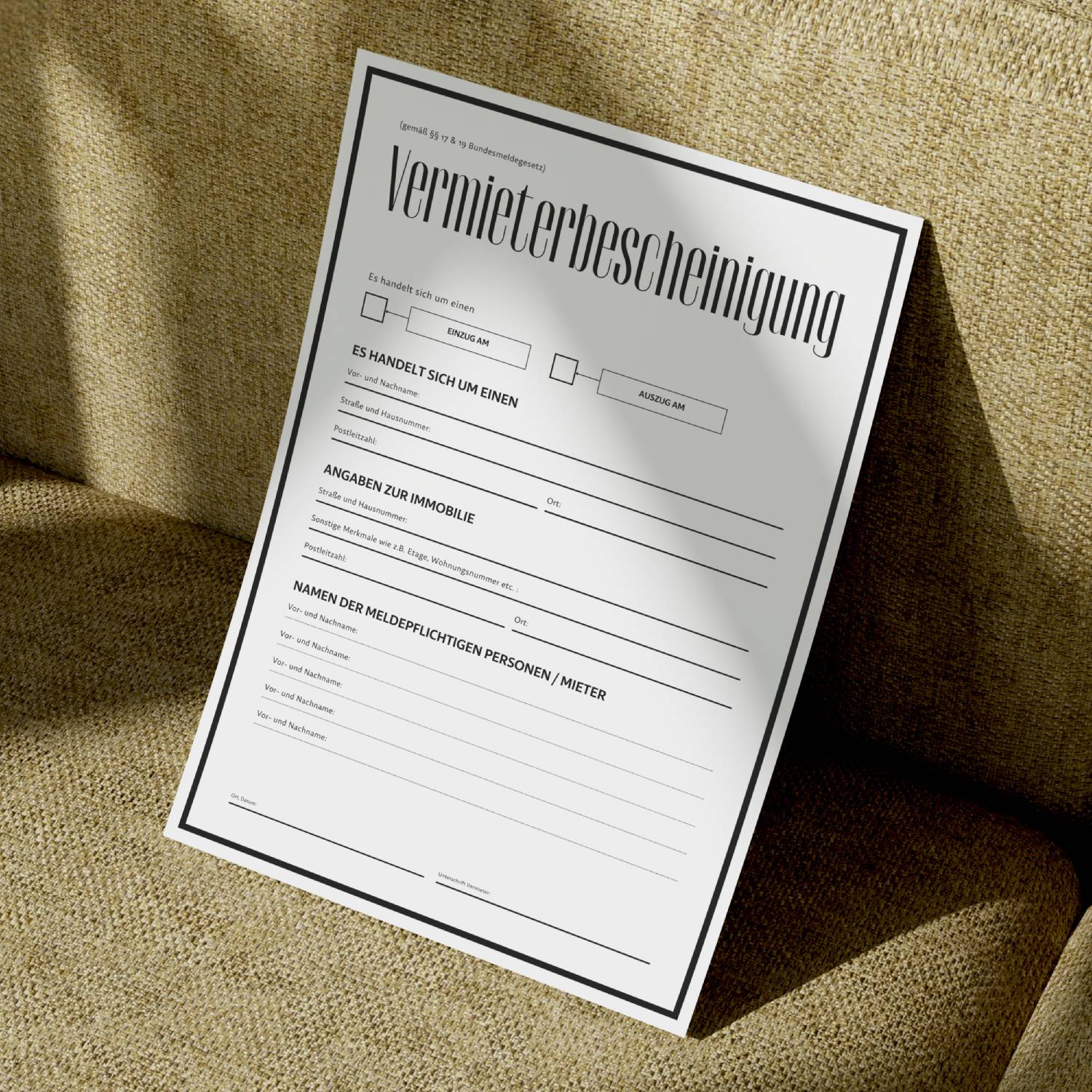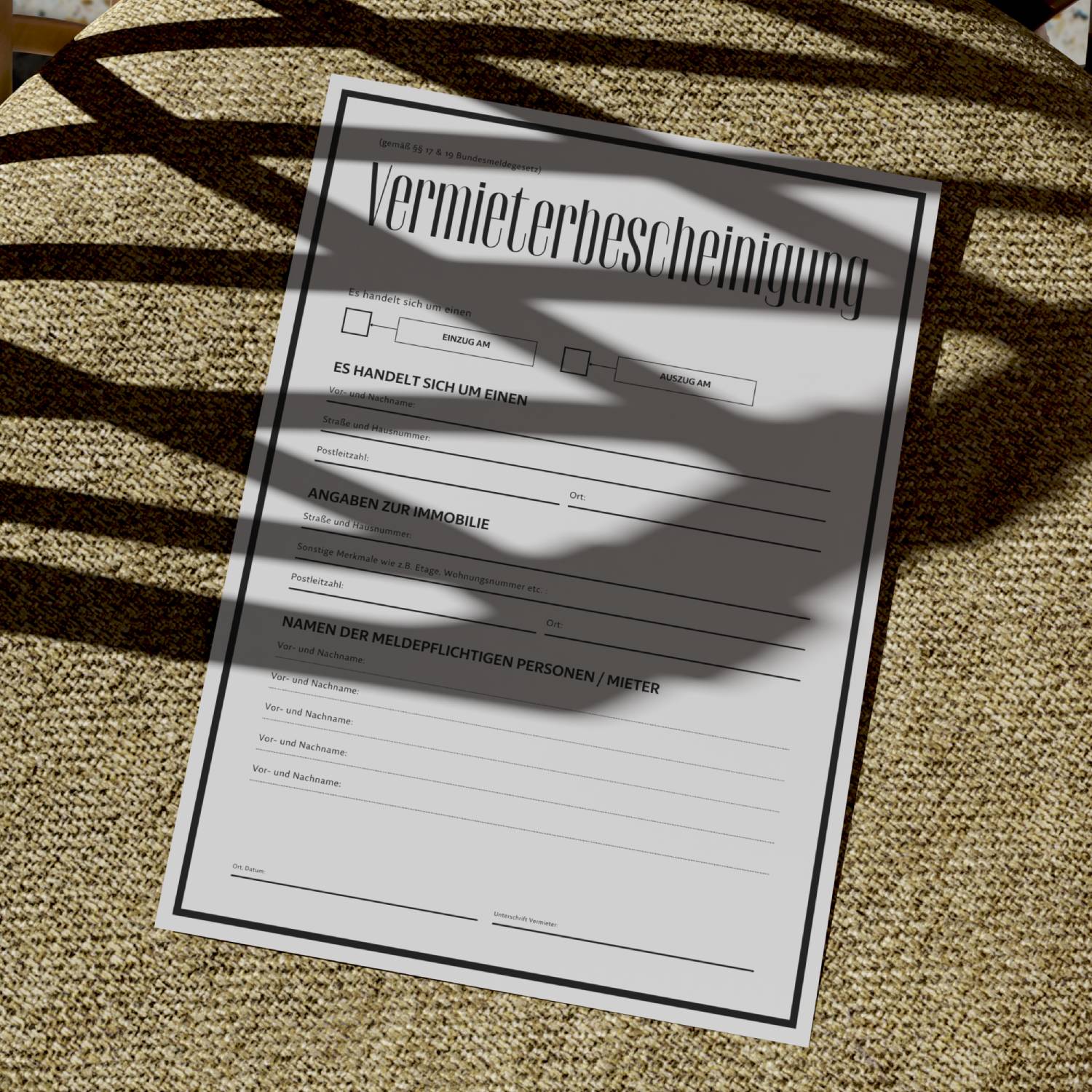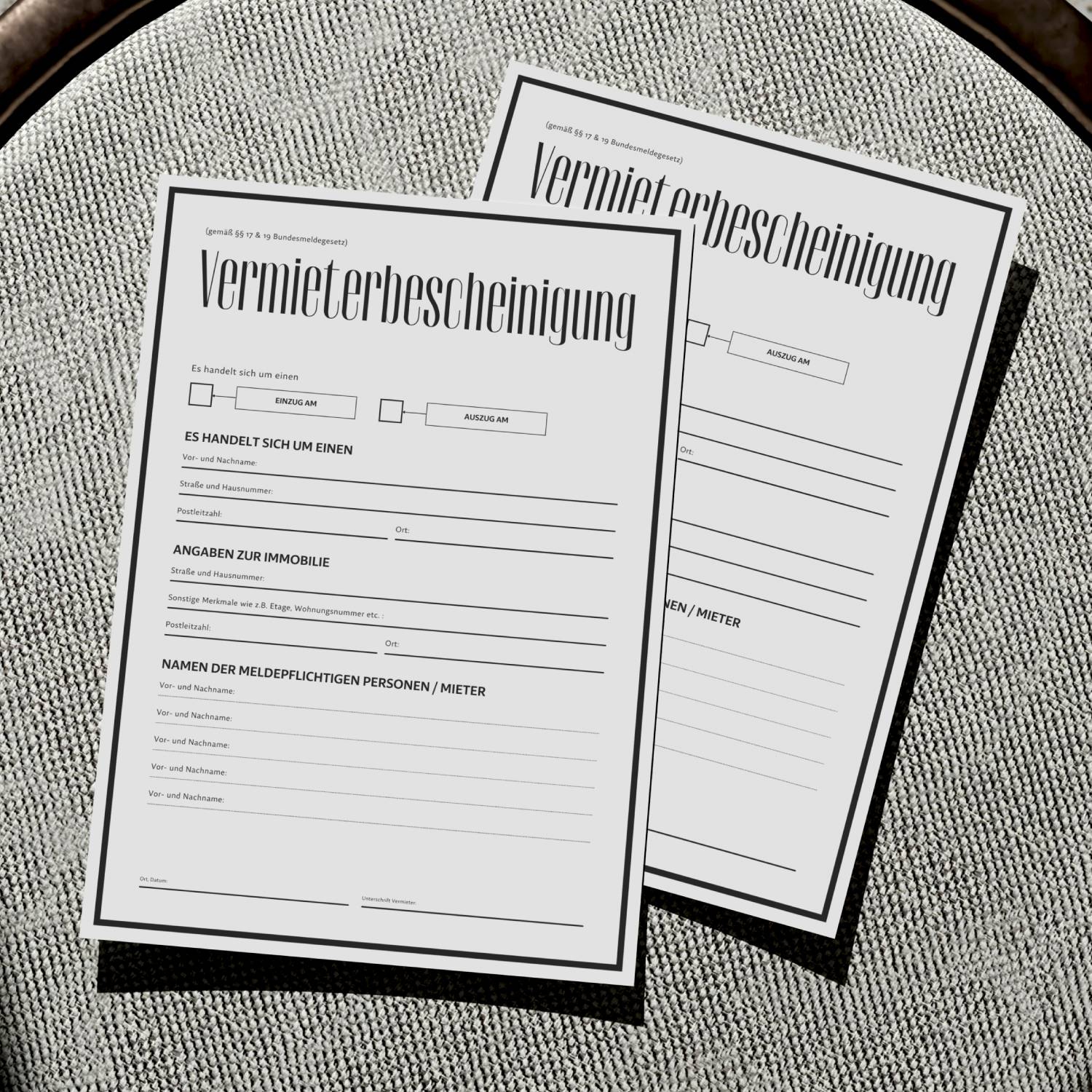 Weitergabe: Die Vermieterbescheinigung wird vom Mieter beim Einwohnermeldeamt eingereicht. Eine Weitergabe an andere Dritte ist nicht zulässig.
